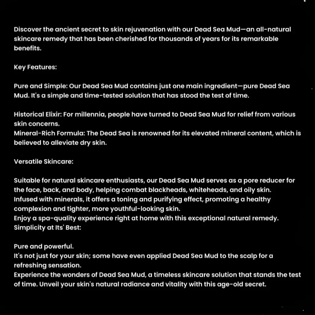 Our Deep Sea Mud is meticulously processed to ensure it retains its full spectrum of beneficial minerals and properties, free from harsh chemicals, synthetic fragrances, and unnecessary additives.