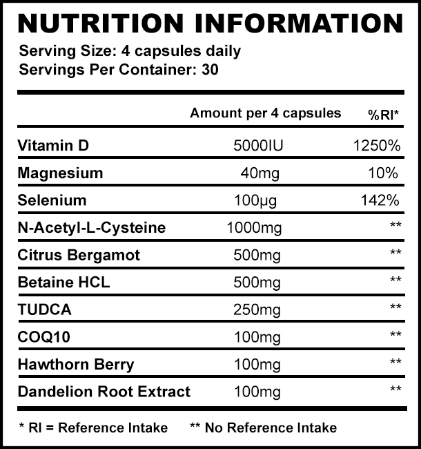 TUDCA 250mg – The heavy weight ingredient, well known to improve liver and Kidney Health. Powerful anti oxidant properties.