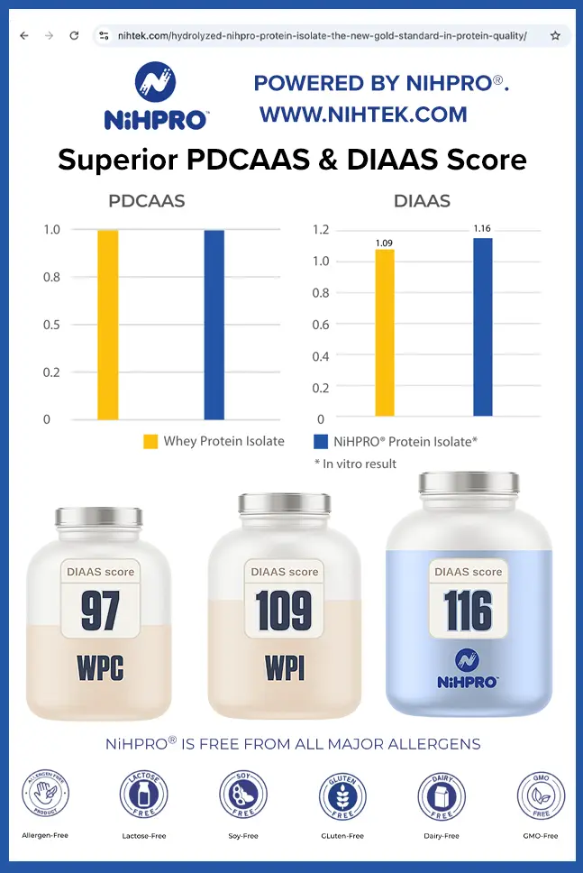 Superior Digestibility Score: NiHPRO™ boasts a Digestible Indispensable Amino Acid Score (DIAAS) of 1.16. For context, high-quality WPI typically scores around 1.09.