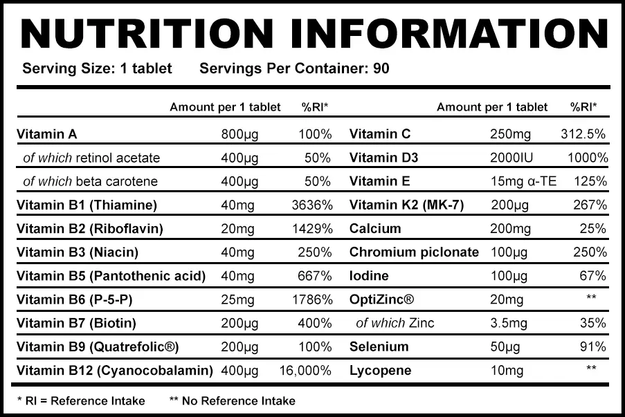 Every two-tablet serving of Strom Sports Multimax is a powerhouse of essential vitamins and minerals, working synergistically to support your body’s most vital functions.